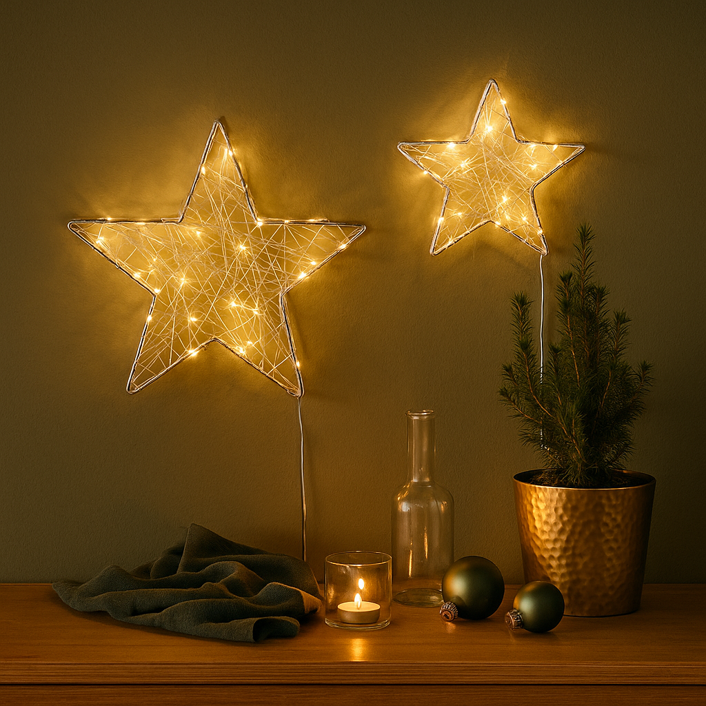 Ein funkelndes Highlight für die Winter- und Weihnachtszeit: Der silberne LED-Stern bringt mit seinem modernen Drahtdesign und 140 warmweiß blinkenden LEDs stimmungsvolles Licht in ihr Zuhause. Ob als Fensterdeko, Wandakzent oder auf dem Sideboard – dieser Stern sorgt für festliche Eleganz und sanften Lichterglanz.