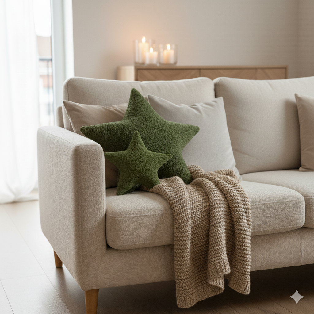 Ein stilvoller Akzent mit Wohlfühlfaktor: Dieses weiche Stern-Kissen in elegantem Waldgrün bringt natürliche Ruhe und moderne Gemütlichkeit in Ihr Zuhause. Die flauschige Oberfläche erinnert an feinen Bouclé-Stoff und sorgt für ein besonders angenehmes Gefühl. Ob als Deko auf dem Sofa, im Lieblingssessel oder als liebevolle Ergänzung zur Winterdeko – das Kissen setzt einen harmonischen, warmen Akzent und lässt sich wunderbar kombinieren.