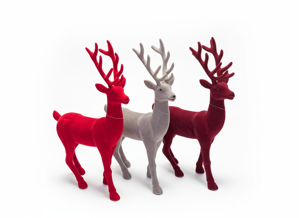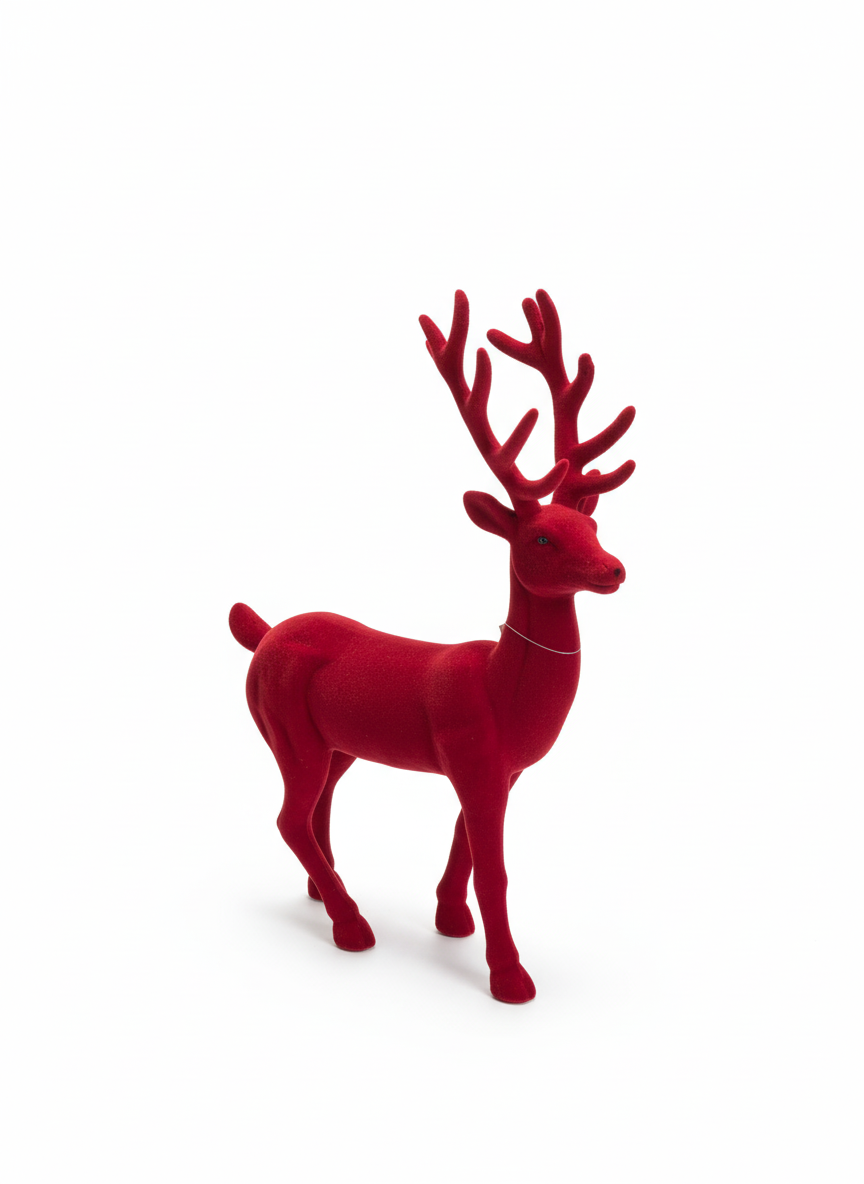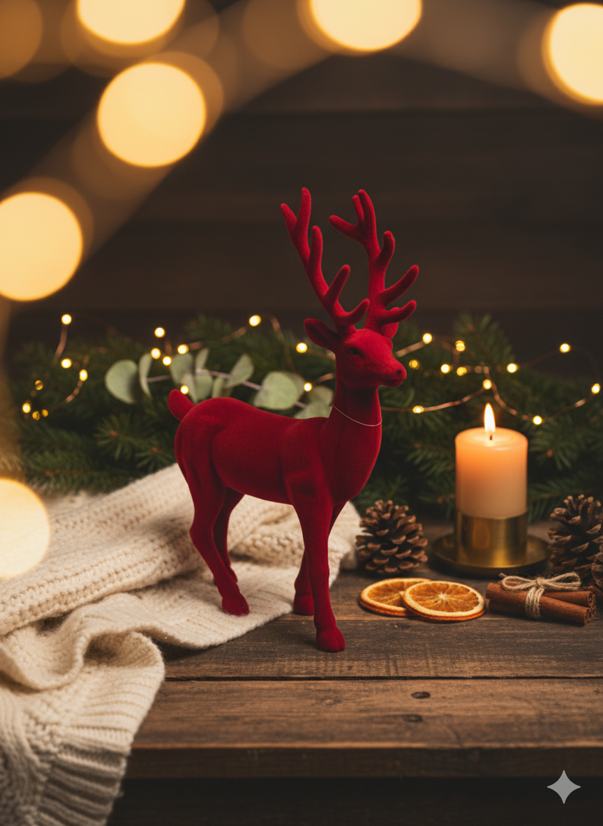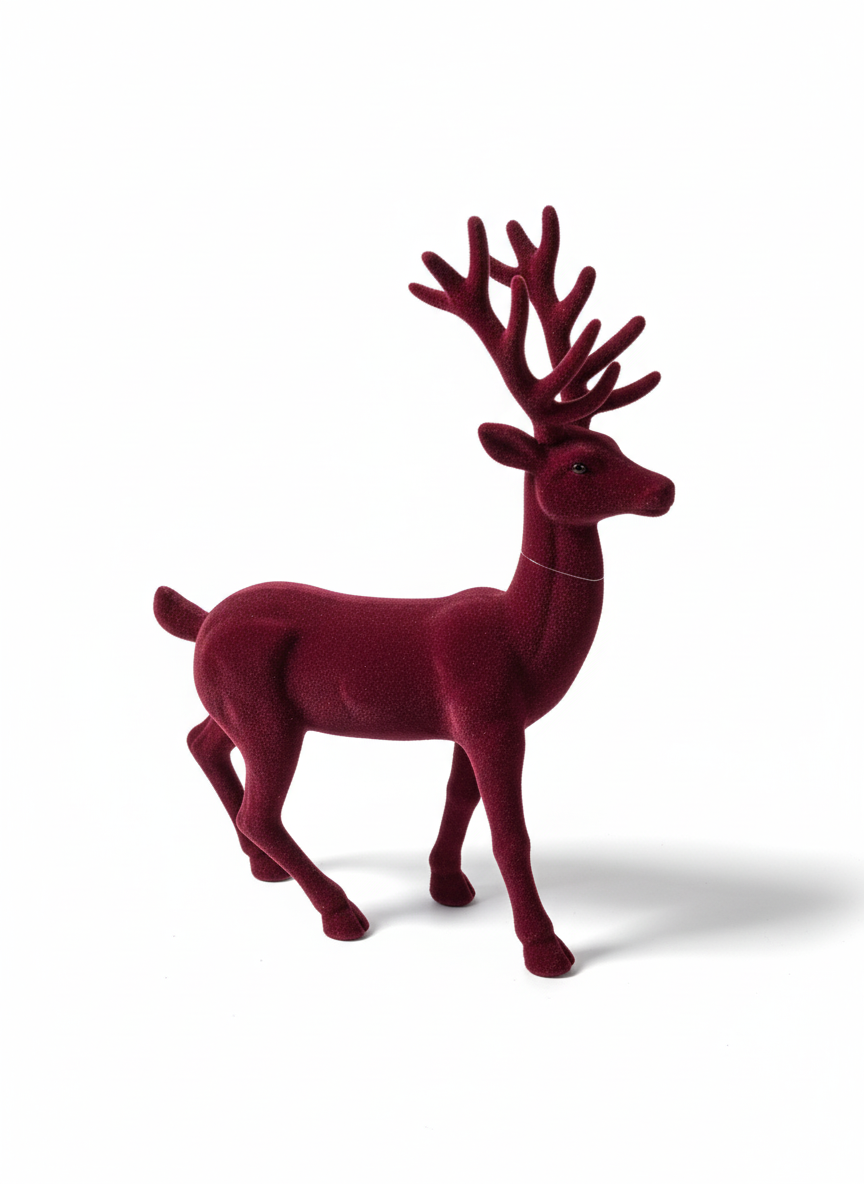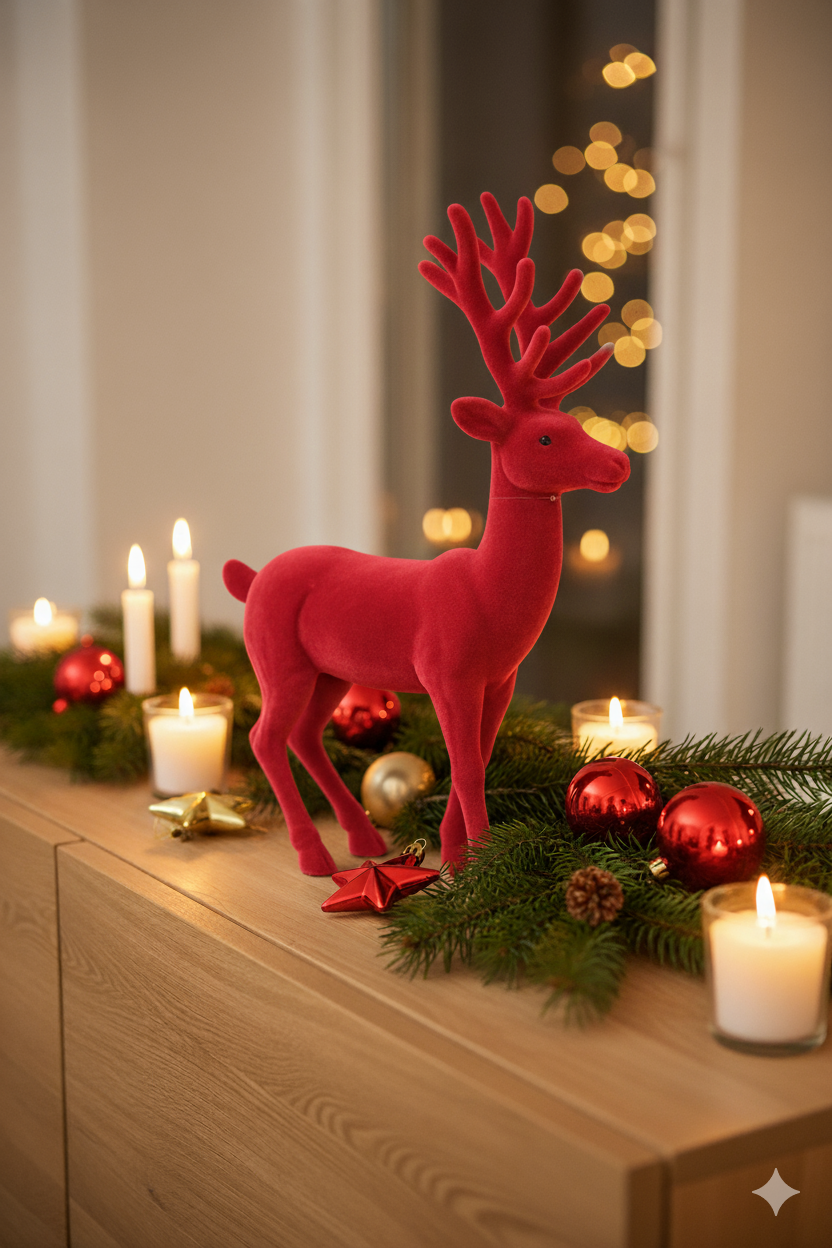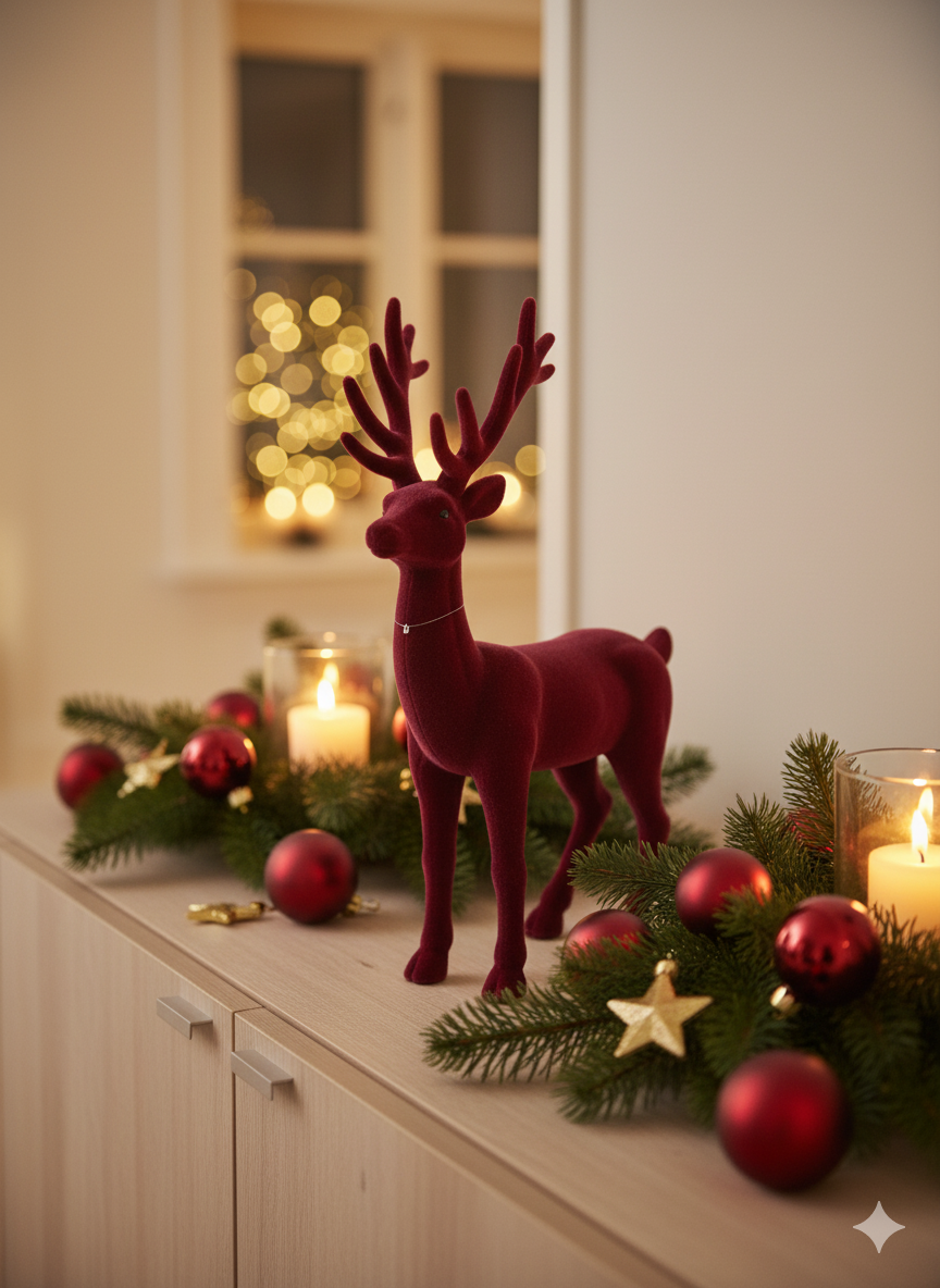 Erhältlich in mehreren farbenfrohen Varianten – von festlichem Rot über edles Grau bis hin zu tiefem Bordeaux – lässt sich der Hirsch perfekt mit Lichterketten, Tannenzweigen oder goldenen Akzenten kombinieren.