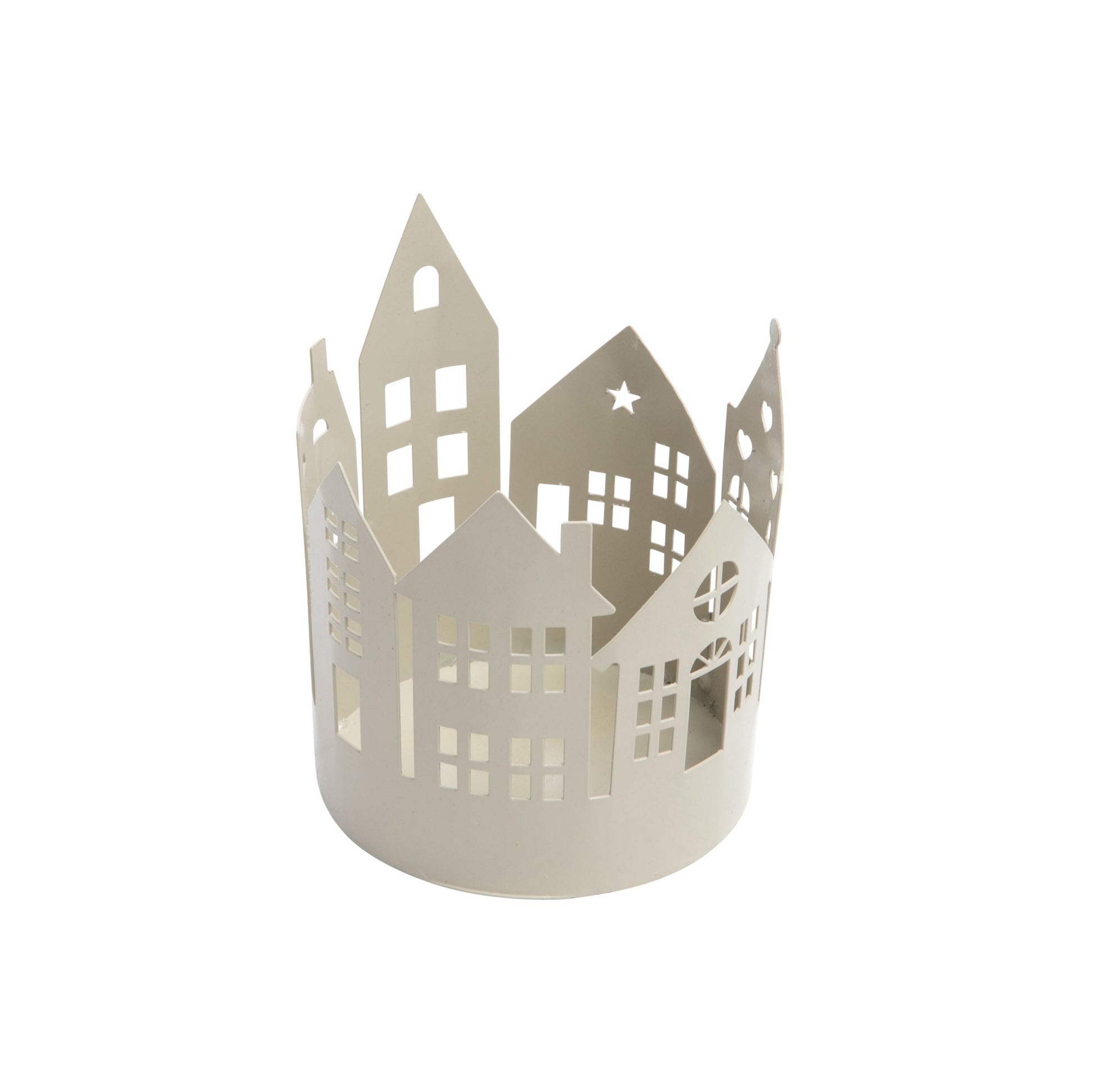 Zaubern Sie mit diesem stilvollen Windlicht eine behagliche Atmosphäre in Ihre Wohnräume. Die Häuserfront in sanftem Beige verleiht Ihrer Dekoration einen charmanten, urbanen Akzent und erinnert an klassische Giebelhäuser. Das mittig platzierte Glas schützt die Flamme zuverlässig und sorgt für ein sanftes, gleichmäßiges Lichtspiel durch die ausgestanzten Fenster.