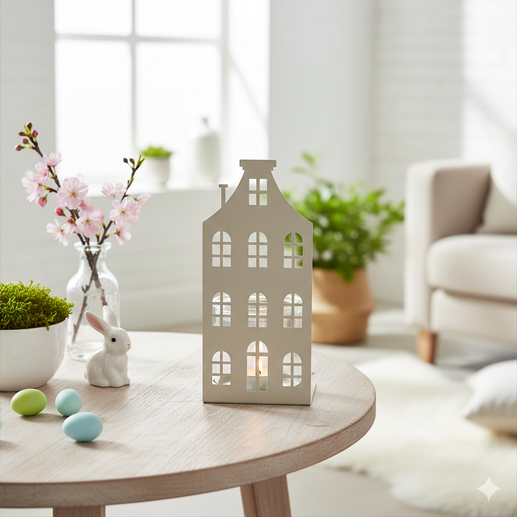 Zaubern Sie mit diesem stilvollen Windlicht eine behagliche Atmosphäre in Ihre Wohnräume. Die Häuserfront in sanftem Beige verleiht Ihrer Dekoration einen charmanten, urbanen Akzent und erinnert an klassische Giebelhäuser. Das rückseitig platzierte Glas schützt die Flamme zuverlässig und sorgt für ein sanftes, gleichmäßiges Lichtspiel durch die ausgestanzten Fenster.